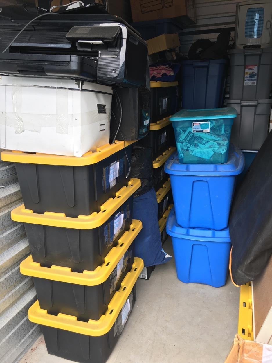 Bed, 70 Inch TV, love seat, computer desk, clothes and kitchen ware. Everything will be stored in large Walmart container bins