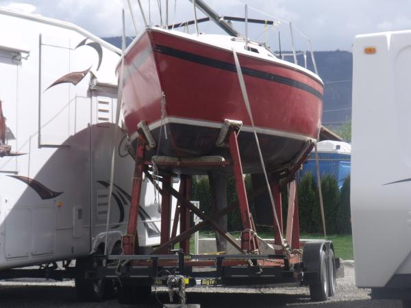 Boat on home built steel frame (4" sq. tubing) and attached to dual axle car hauler (3100 kg. GVW). Boat can be transported on frame (have extra commercial rated tie down strap - two already in place), but will need low bed to meet height restrictions (now 13' 4"). Can also be transported with sail boat trailer that handles fixed keel. Car hauler currently does not meet BC regs due to having only single axle brakes. Can arrange for crane truck to lift/move if shipping transport vehicle does not have.
