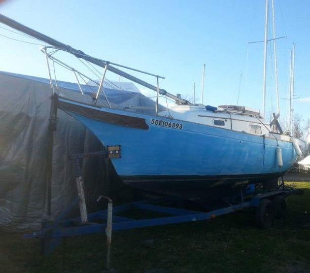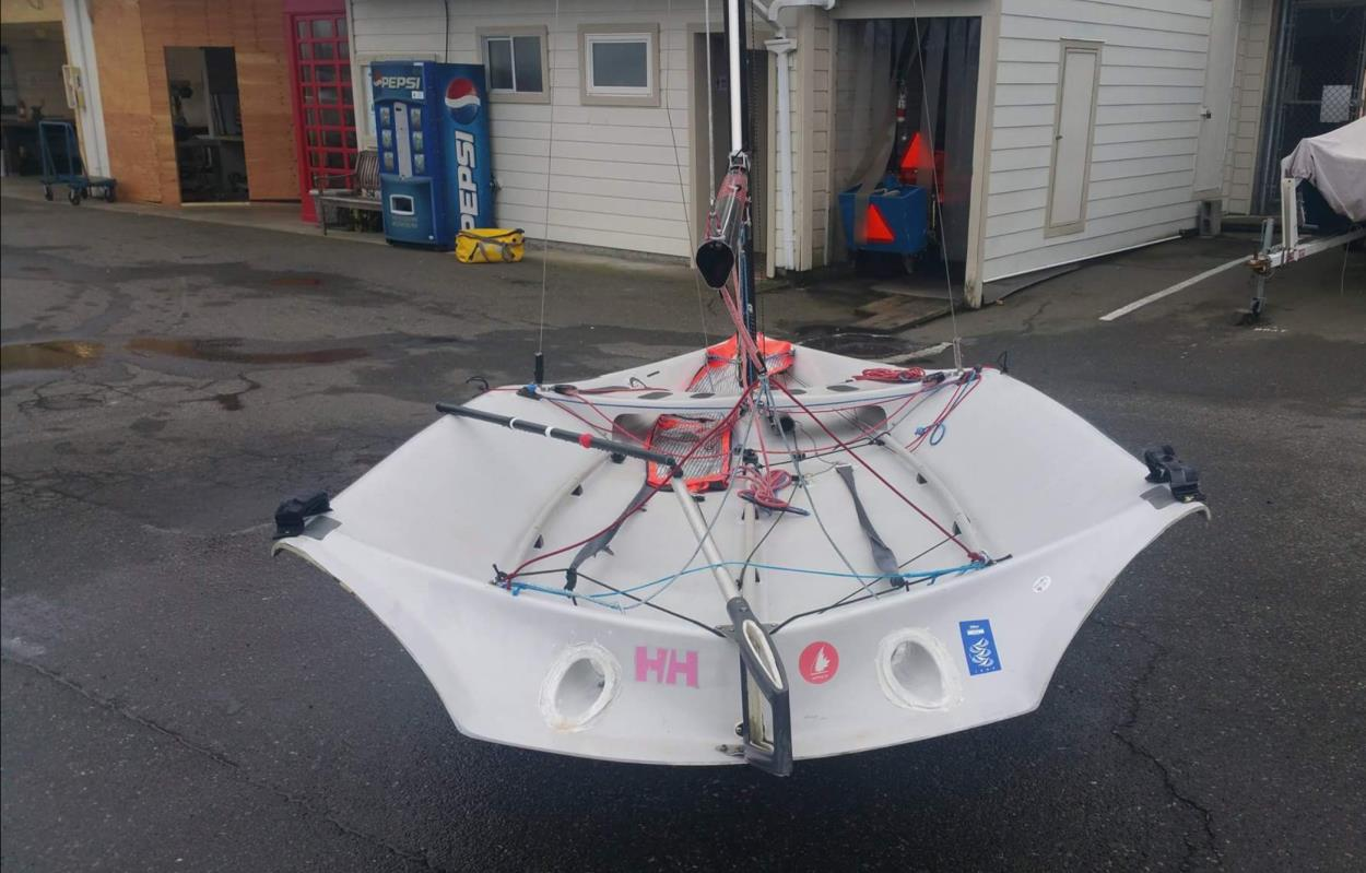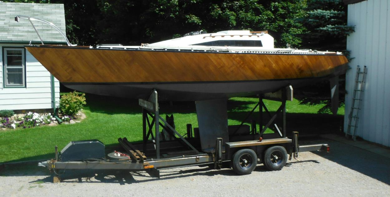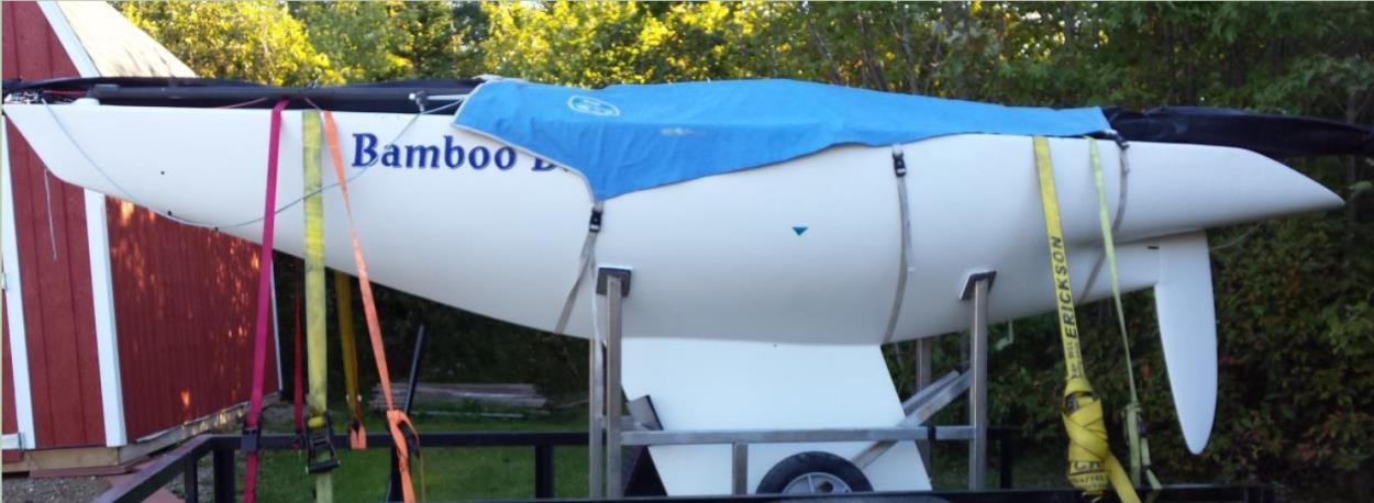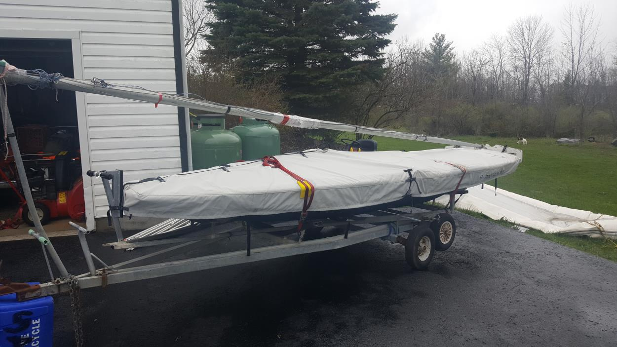 Boat is on a sturdy metal cradle. Height is approximate. Must be transported with a mast measuring approximately 40 feet.