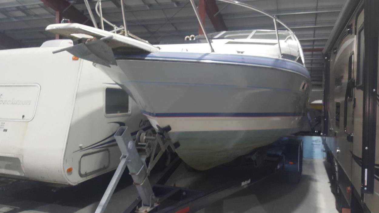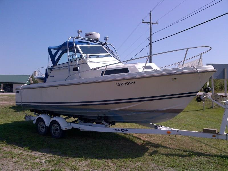 Boat is on a triple axle trailer with new tires, greased hubs and brakes on two axles.