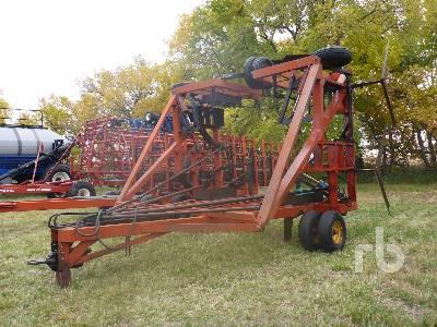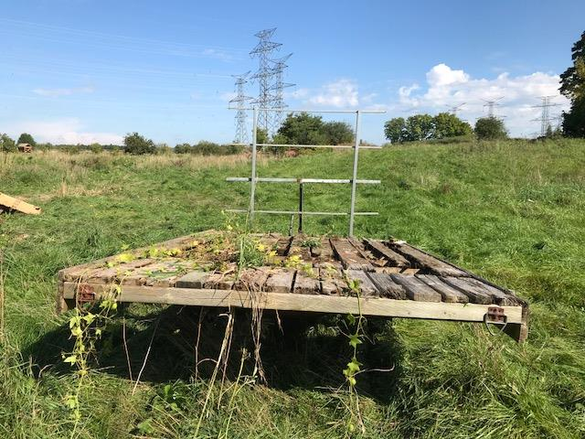 8’2” wide, 16’5” long, single axle, tires flat, old rotten boards on top will be removed. Estimated height is 8’3” at the front side piece. It can be removed via bolts if needed. Will need to be winched on at pick up. Can be taken off with help of tractor at delivery if needed.