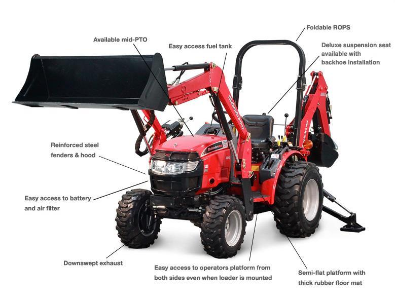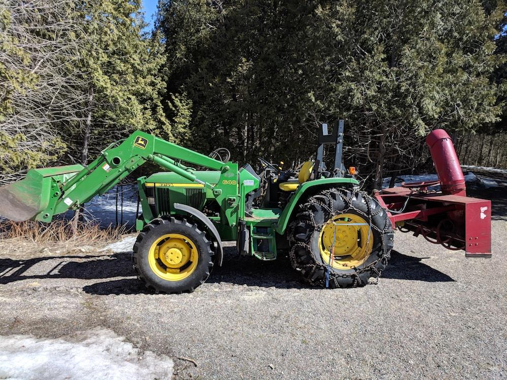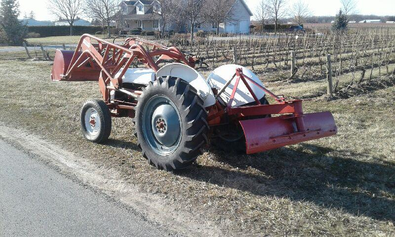 Has front end loader on front and box plow in rear.