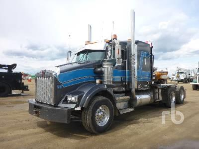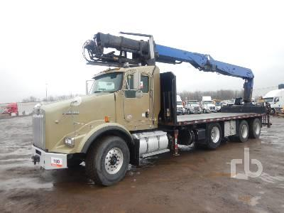 Paccar MX, 485 hp, eng brake, Eaton Fuller 18 spd, air lift 3rd axle, Chalmers susp, 20000 lb frt, 46000 lb rears, 60 in. axle spread, alum wheels, FRF 24 ft 6 in. flat bed, rear mtd knuckle boom, hyd outriggers, dual controls, wallboard forks, BIEGE