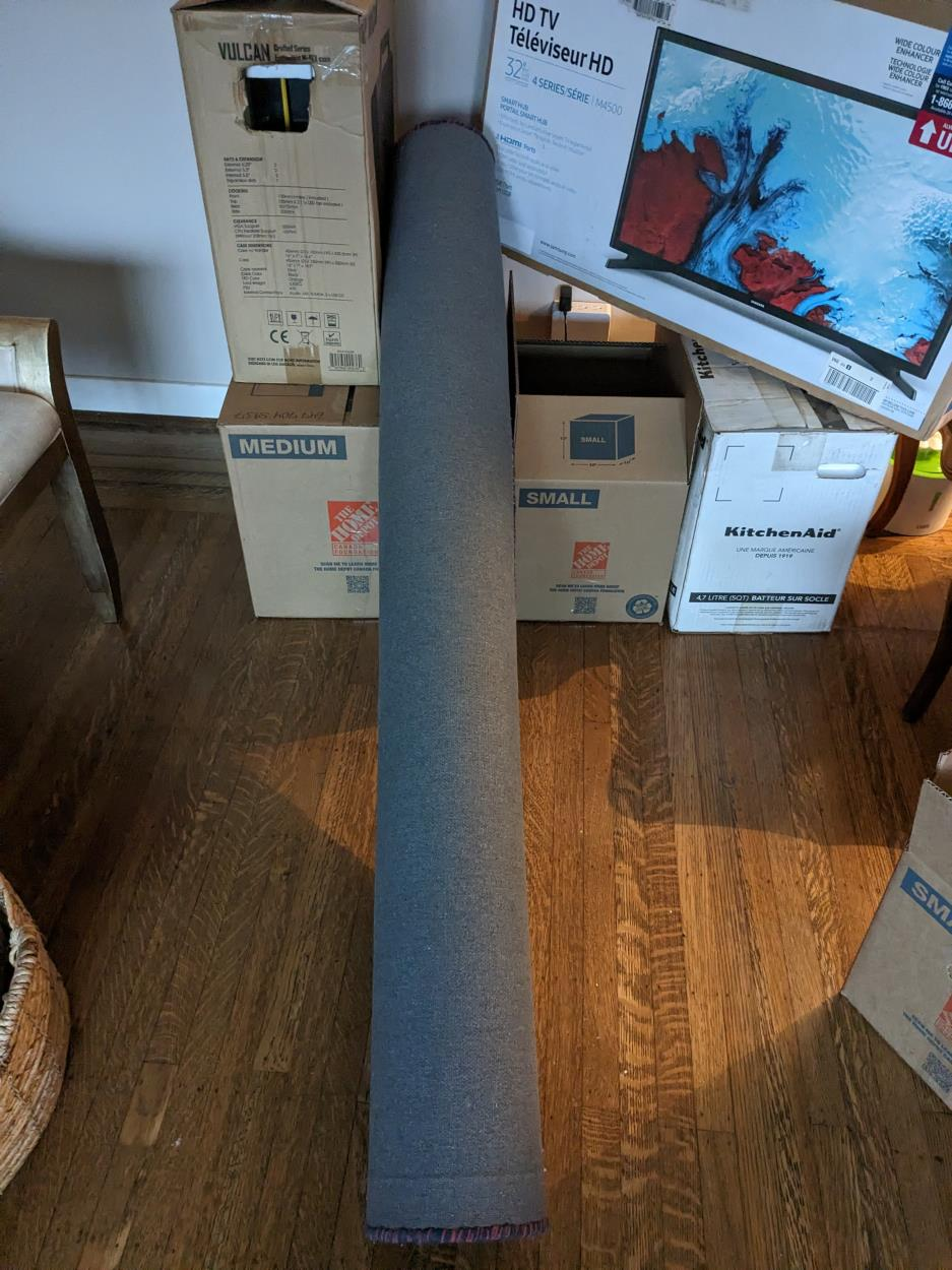 LR: Hide-a-bed sofa with chaise (heavy), wing chair, 3 coffee tables, plant table, tall cat tower, fake fireplace, 2 mid size and 2 tall and skinny bookshelves, 42" flat screen TV. Large heavy armoire. Portable floor a/c unit. (guess 30 med boxes)