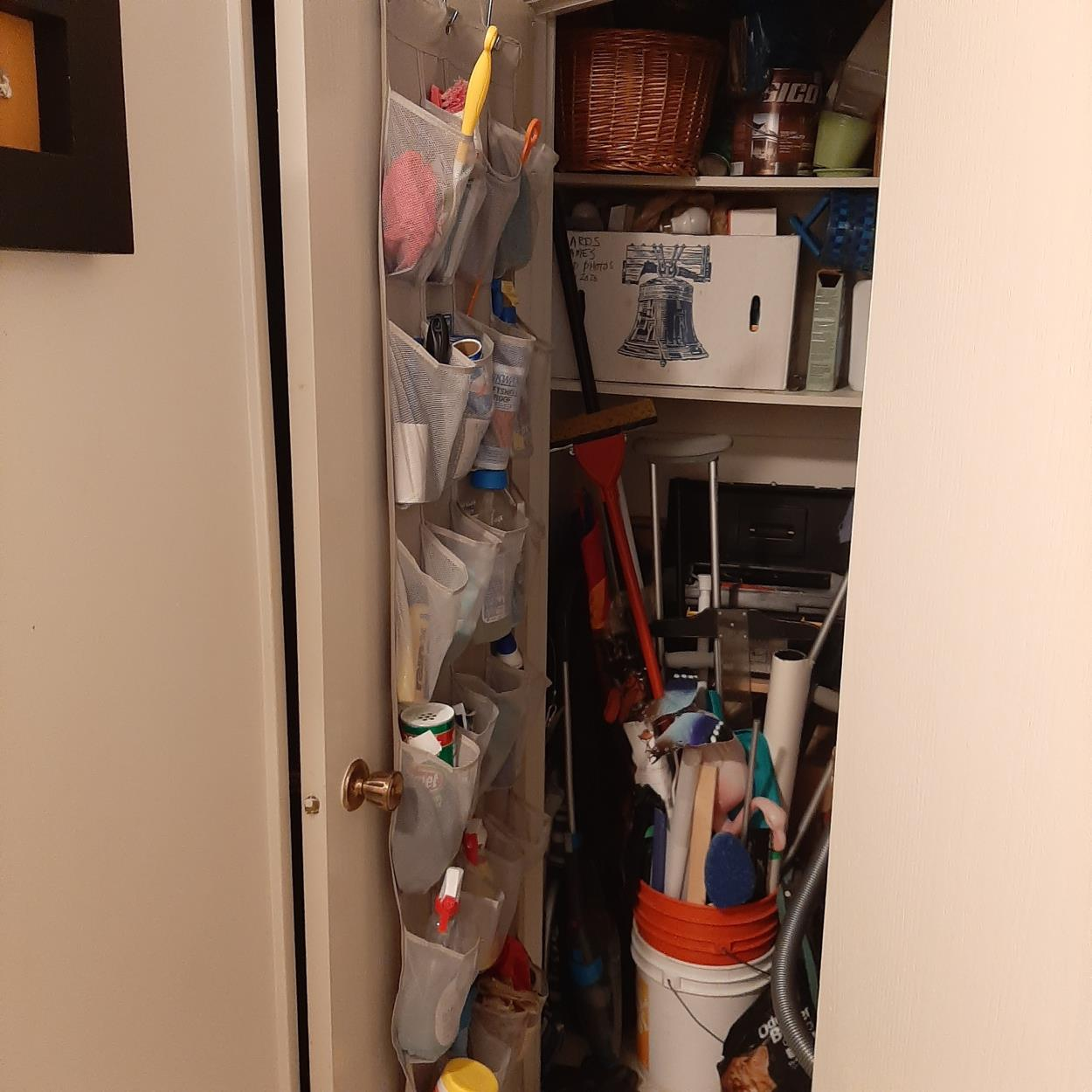 Storage room: guess 25 boxes, 5 gallon pail full of tall items taped together. 2 Small vacuums. Bathroom guess 5 medium boxes