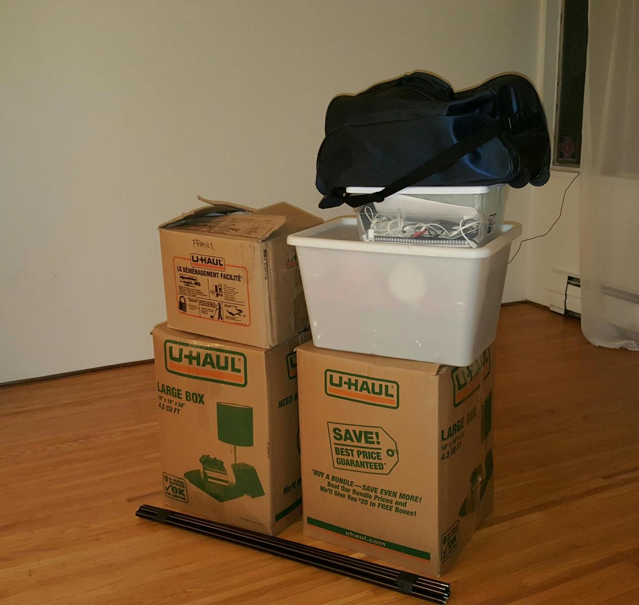 Will add: my small TV, guitar, a few more garbage bags of non-breakables, and some suitcases. I am moving to Calgary to start a new job and will find my apartment within the next week!
