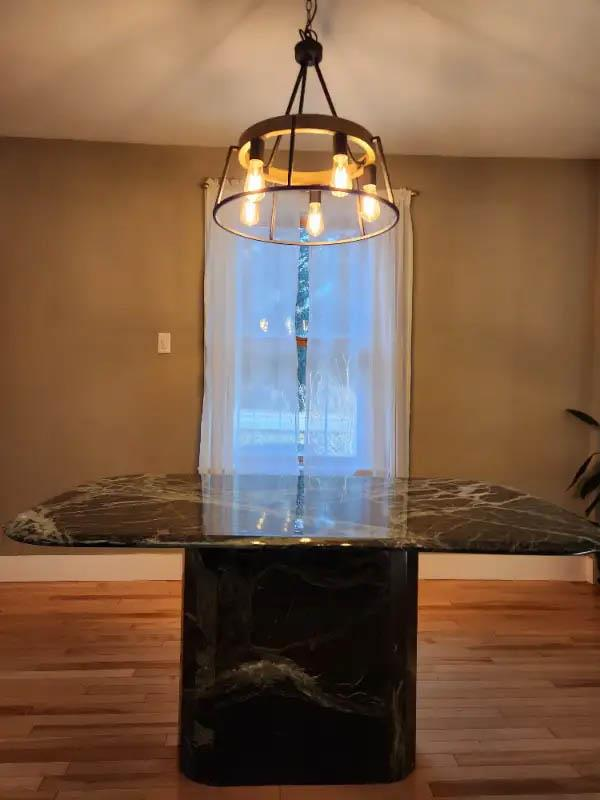 Very heavy load! Will need at least 2 people to lift the table at the pickup location. We can assist unloading the table at the delivery location. The base of the table separates from the top.