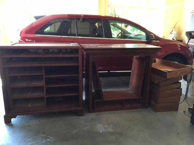 A mix of approximately 40 Rubbermaid tubs and 2c foot boxes containing assorted household goods including kitchen ware, clothing, etc. All boxes were able to be lifted by a senior. Two three drawer bureaus, a rocking chair, and wooden chest. Computer and several monitors, small flatscreen tv, stereo components and speakers, golf clubs, artwork including one large painting about four by five feet. It's all packed and ready to go and stored in a small bedroom with room to spare.