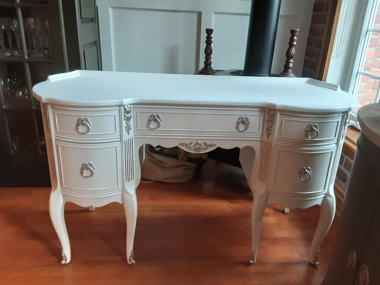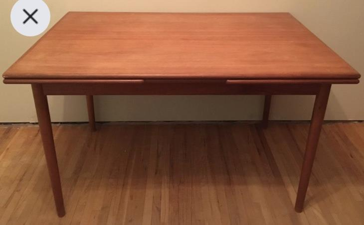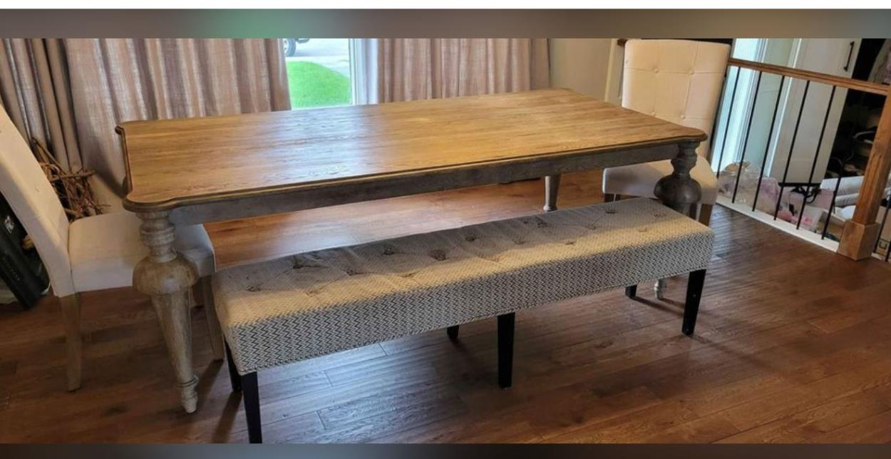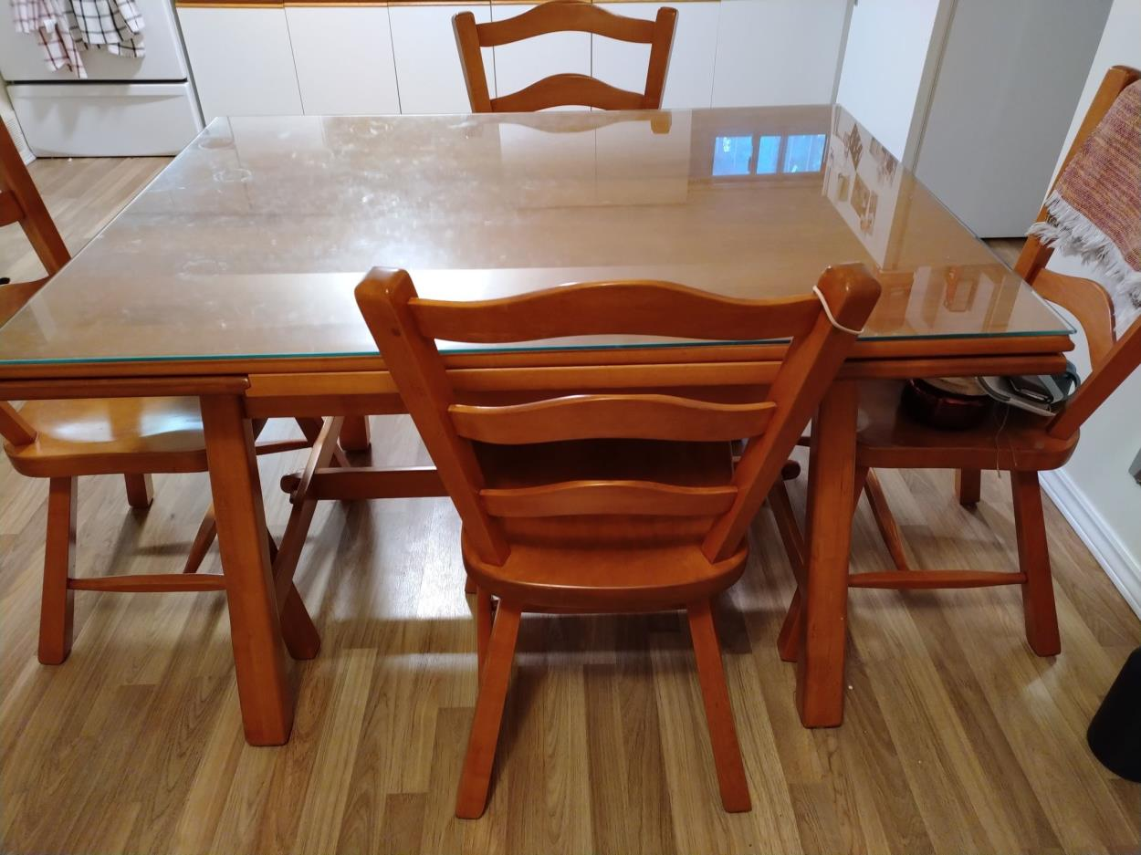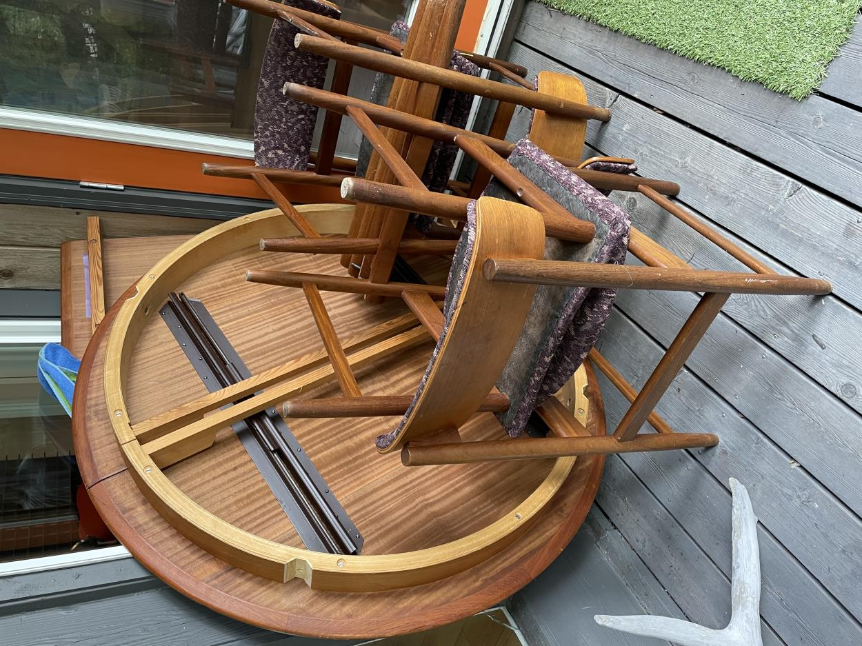 It is a wood dining table (legs taken off), 8 chairs and a table leaf.