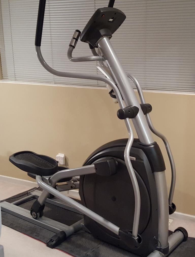 elliptical machine taken apart, 1 heavy piece with base and wheel, and 5 light long pieces