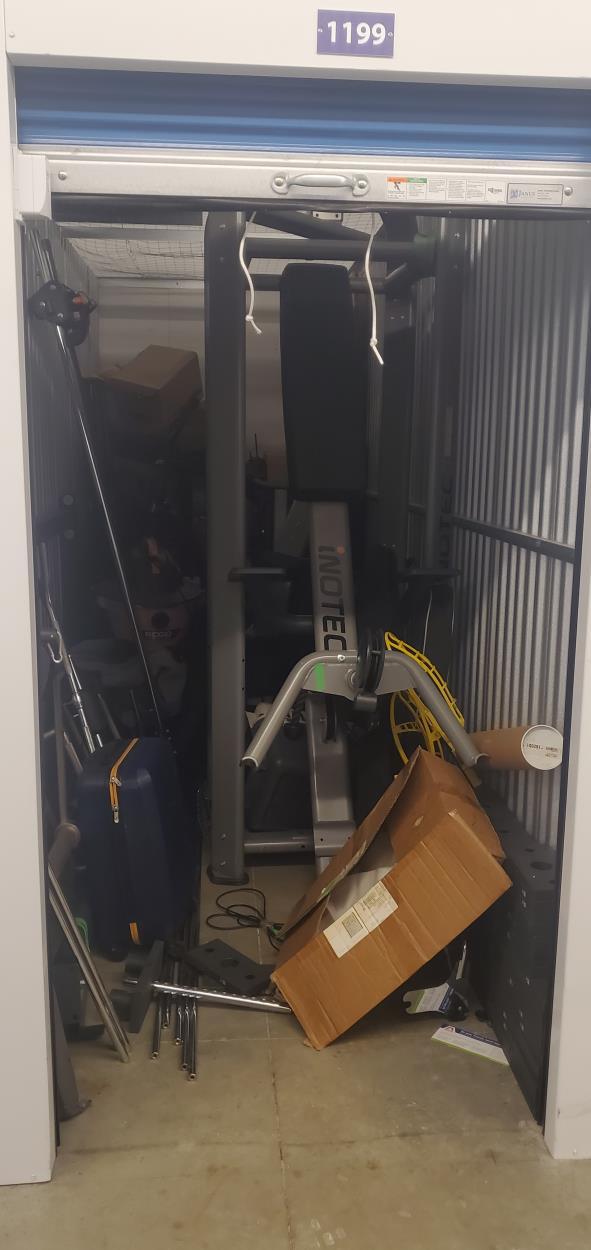 it's a universal gym, weights, other fitness equipment, dumbbells, some boxes as well, size of storage locker is 12' x 5'. All of the equipment is disassembled.