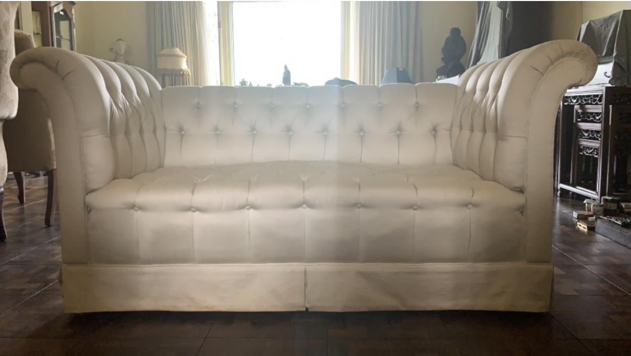 7 items in total (1 small sofa, 1 loveseat, 2 lamps, 2 small filing cabinets, 1 magazine rack)