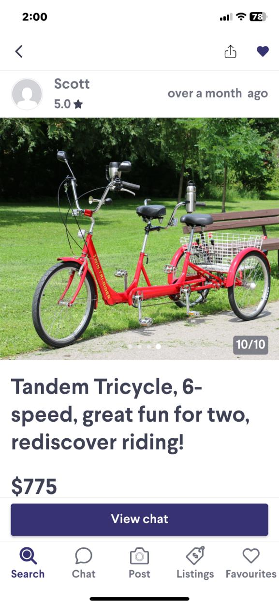 This is actually a rather large, non-motorized tandem, tricycle (three wheeled bicycle). It stands on its own and can be transported inside or outside. Weighs about 70 pounds and can be partially dismantled. Purchased in Ottawa and need it in Fredericton, NB. Thanks