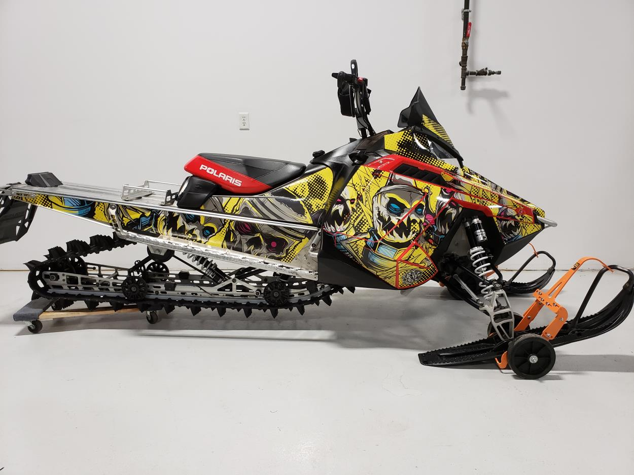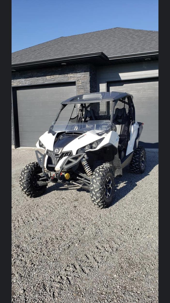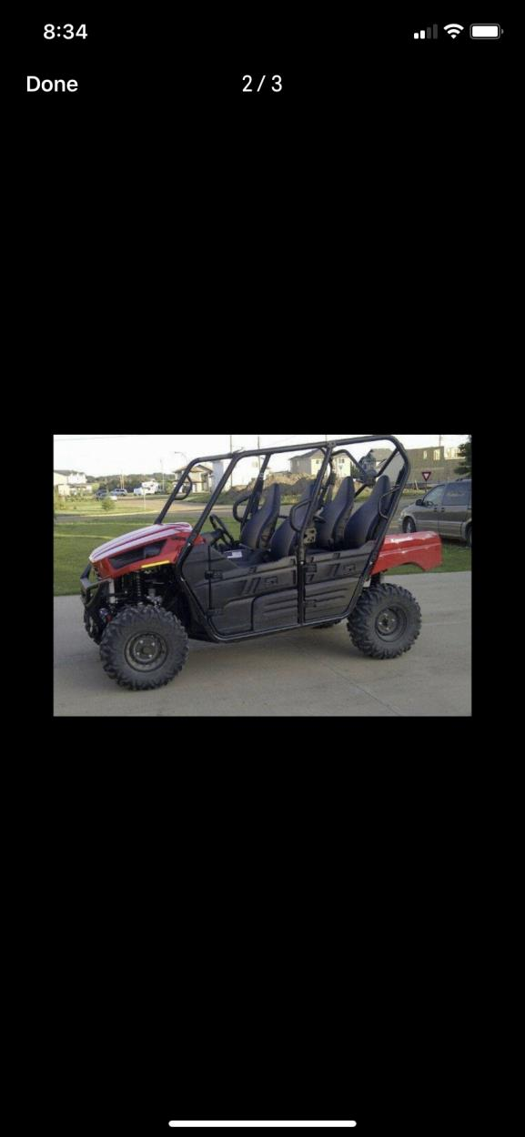 1-four seater sidexside, 1-125cc quad, 2-kids electric cars which are stacked, 1-atv trailer which is standing on end on pallet and 1-polaris hyd snow blade.