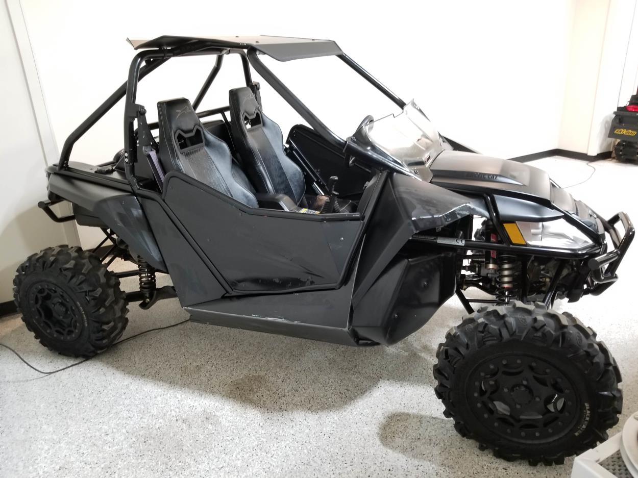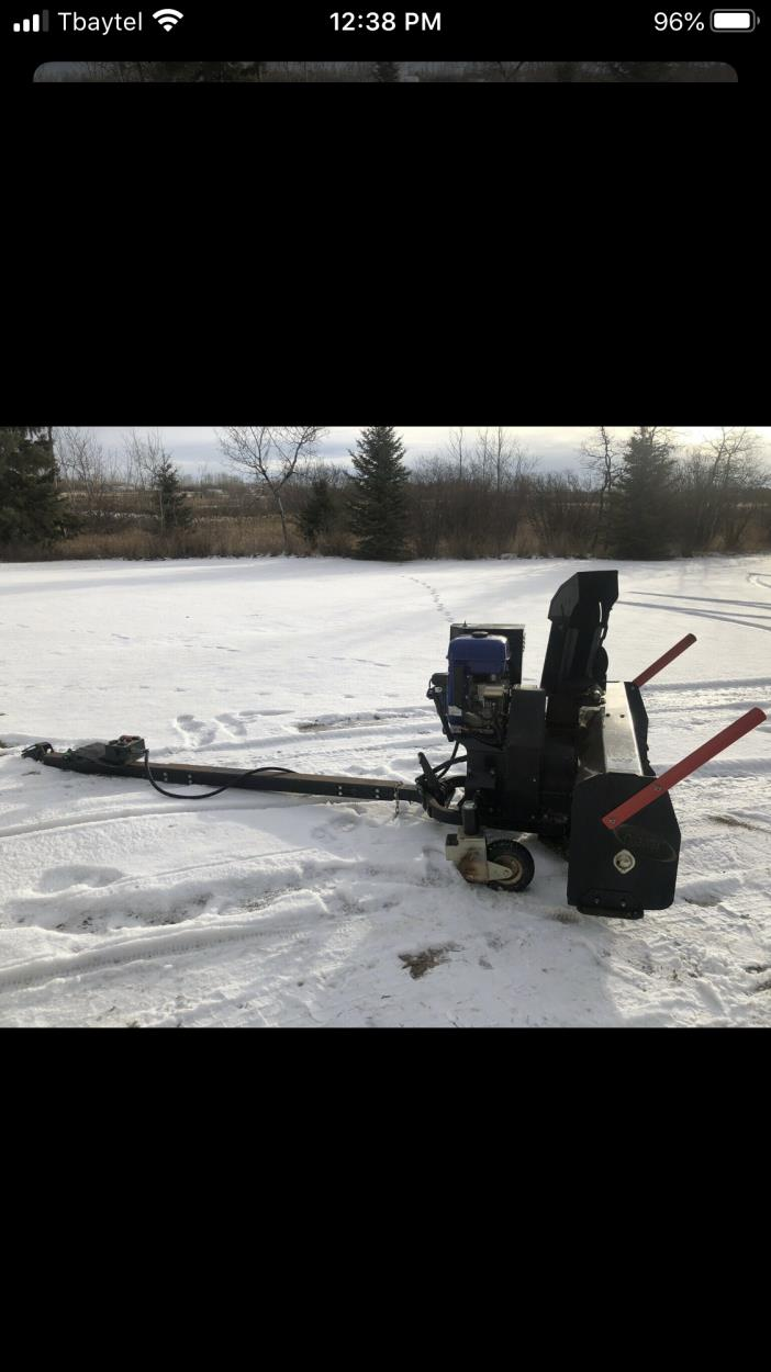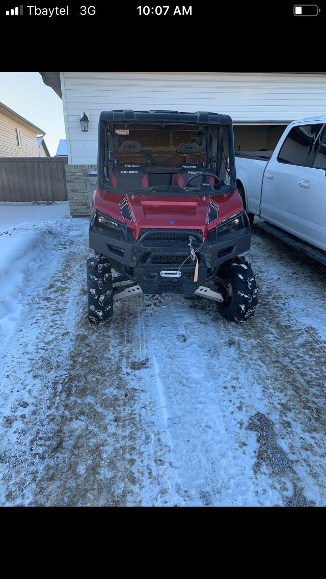 1-four seater sidexside, 1-125cc quad, 2-kids electric cars which are stacked, 1-atv trailer which is standing on end on pallet and 1-polaris hyd snow blade.