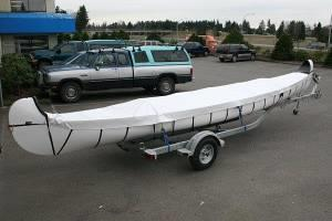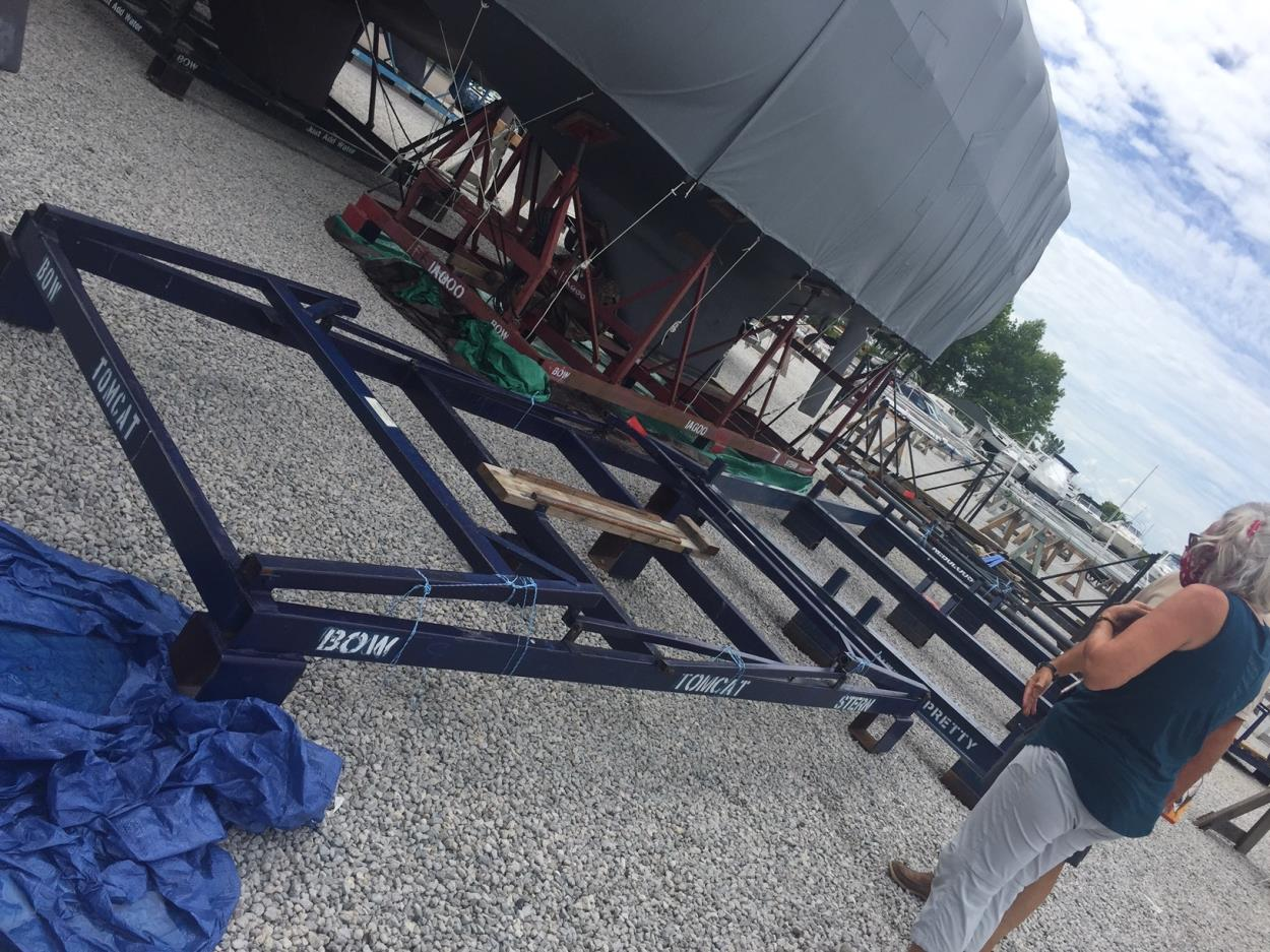 Cradle for sailboat Tomcat, folded and resting on ground. Forklift available for loading