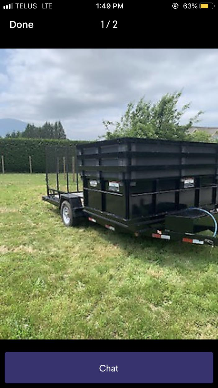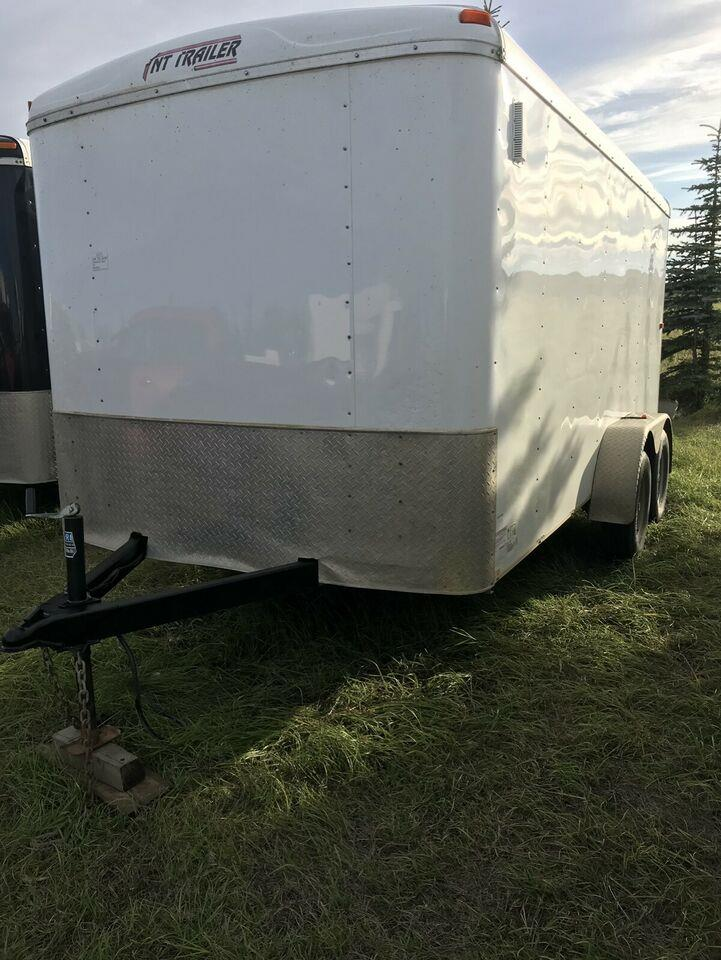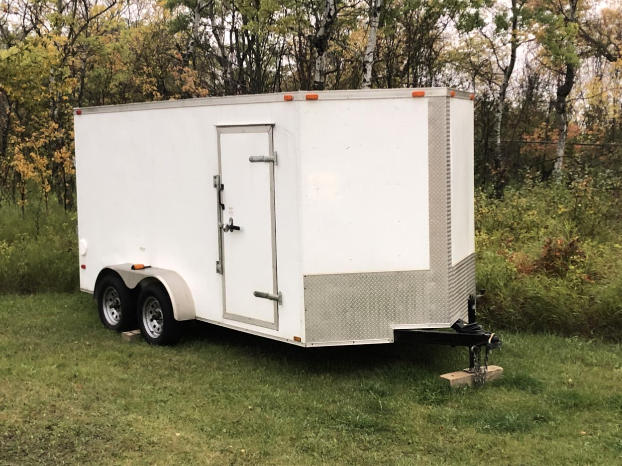 Enclosed 14’ tandem trailer, weighs 2000 lbs with 500 lbs of cargo inside. Has spare tire also. 2 5/16” ball hitch.