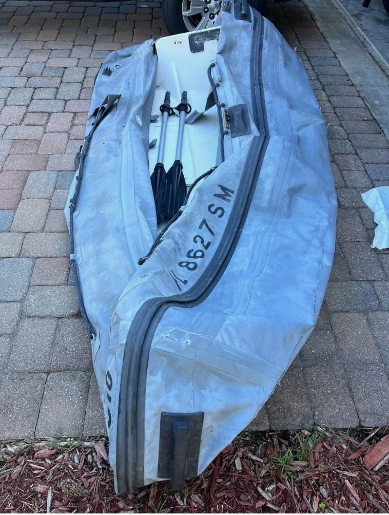 Deflated inflatable boat with 2 oars. Around 8' in length, 4' width. 120lbs roughly.