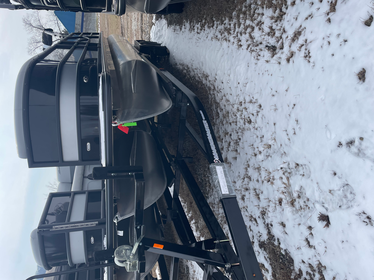 The pontoon in the first 2 pictures is missing the wire harness, temporary lights will need to be used or the lights repaired unless being transported on a gooseneck flatbed. The other trailer has a 4 pin light harness and 50% tires.