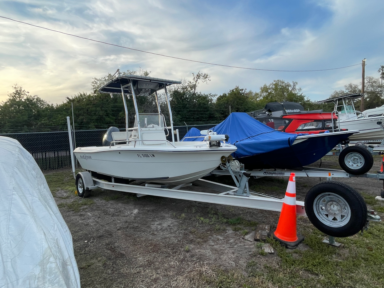 We Have a trailer for this boat in Traverse City, MI that can be pick up to take down to Florida to get the boat. Unless you have one that will fit it. It's in rack storage and the marina will help you load on the trailer.