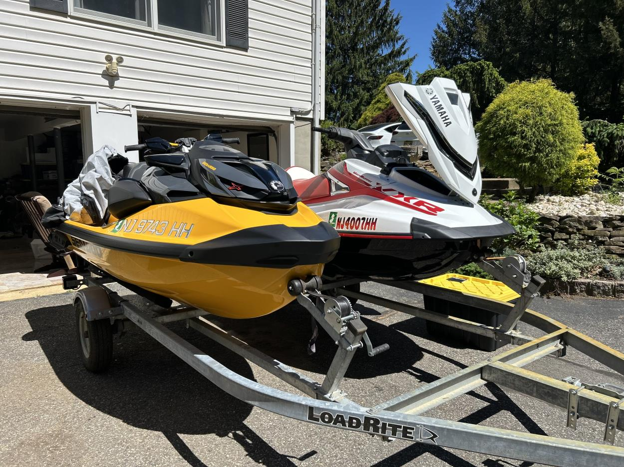 Double personal watercraft trailer with one jet ski on it single axle with a 2 inch tow hitch ball