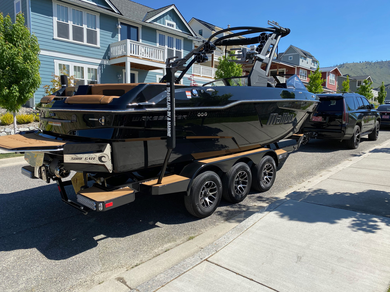 The boat is on a trailer, and the trailer folds down if needed. The trailer is a triple axle and is fully functional for tow away.