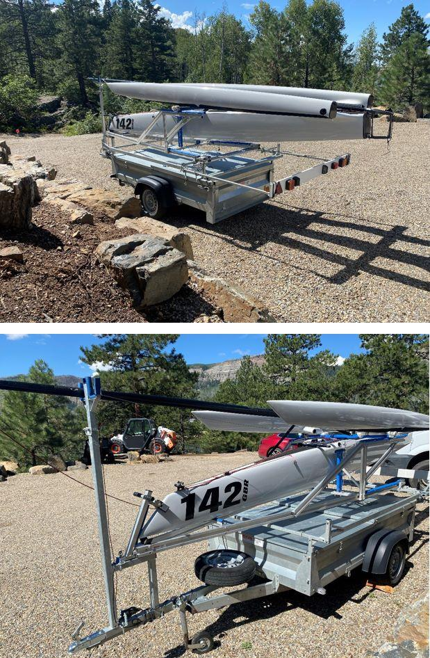 Mast is 20 ft. long and overhands boat 3 ft on both front and back. Trailer accepts 1 7/8" ball.