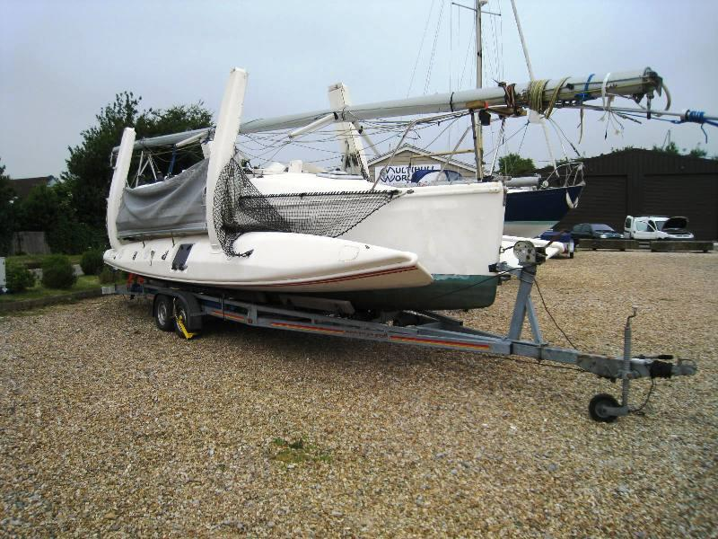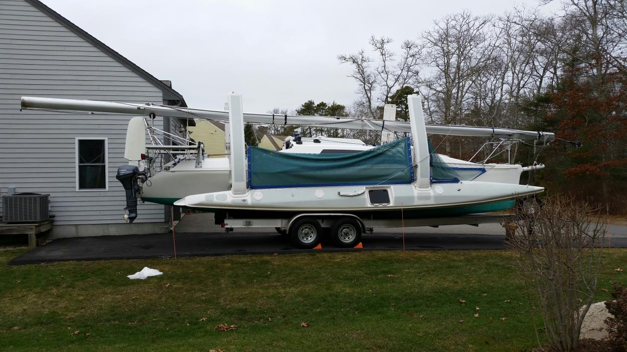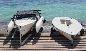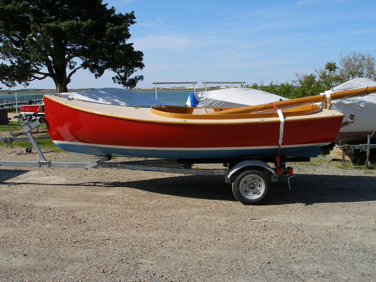12-foot 400-pound sailboat on a small flatbed trailer. Easily pushed around, narrow enough to fit in a container, lowboy, or car hauler (hopefully), or towed behind the smallest vehicle.