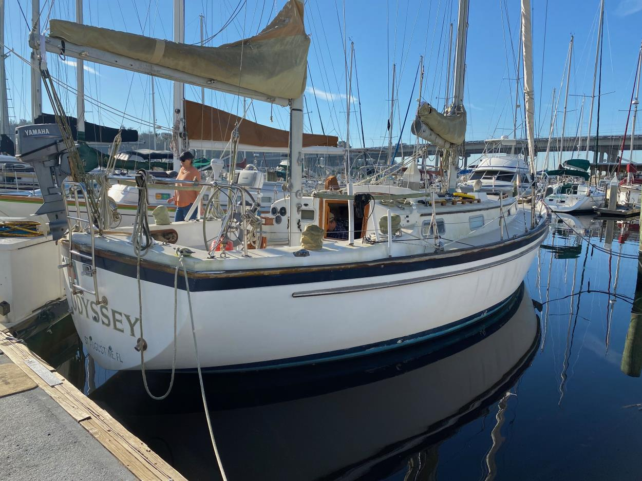 Please look closely at photos. Weight of boat including aluminum trailer: 7,000 lbs. Length of boat & trailer excluding mast: 36 feet. Total length counting furler and mast: 46.5 ft. Width is 8.5 feet. There are two sets of rear lights, one on trailer and one on boat. Height above road is 11.5 feet. Mast extends 7 foot beyond back of boat at 10-11 feet off the ground. Furler extends 3.5 feet beyond front of trailer ball. Trailer ball size: 2 5/16. Trailer has disk surge brakes. Trailer is aluminum (except for tongue beam), is rated for 10,000 lbs, has tongue weight of about 650 lbs. Trailer uses 7 pin round electrical connector which must have backup light connection to disengage surge brakes while backing up. Tires new, spare OK. Trailer has current registration.