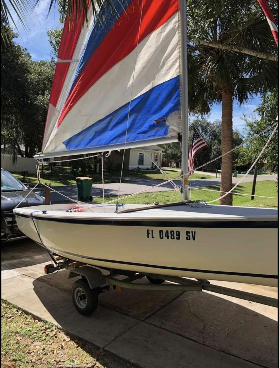 McLaughlin "Opti" Sailboat. Should be able to fit in the bed of a truck, or an SUV with seats folded down. Seller says it fits in his 2020 Chrysler Pacifica with the seats folded down. Mast for boat is 7' 10" long. NO TRAILER