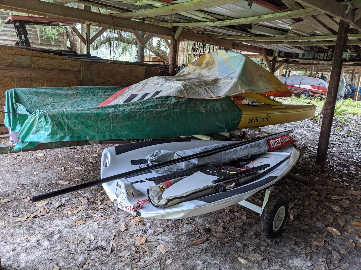 Rudder/centerboard in bag and boom/sails in 2 grey bags as well. Mast comes part into 2 equal length pieces (6' each). All items will all fit on boat deck. Boat can go on car top and accessories inside. Also boat, dolly & accessories fit into back of a minivan (with rear seats removed).