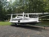 Boat is on trailer with 7.5 m mast tied to mast cradle and rear beam of catamaran. Also included in shipment is a sail in sail bag, cover for boat, the center boards and foils, boom, tiller extension and misc small parts all in three bags. All can easily be stored inside trunk of car