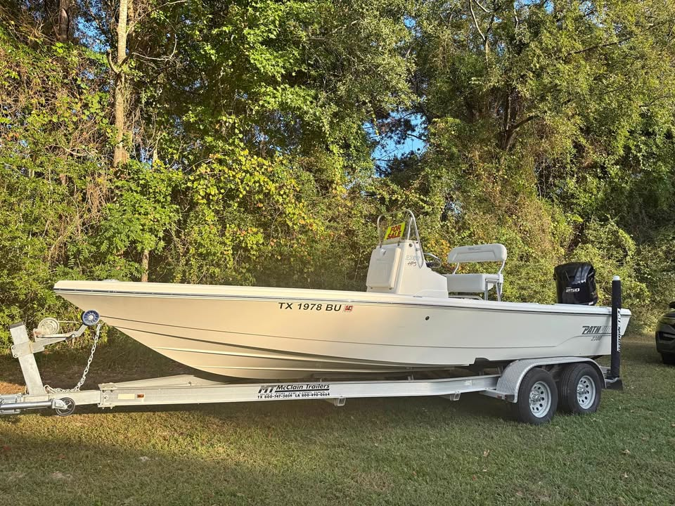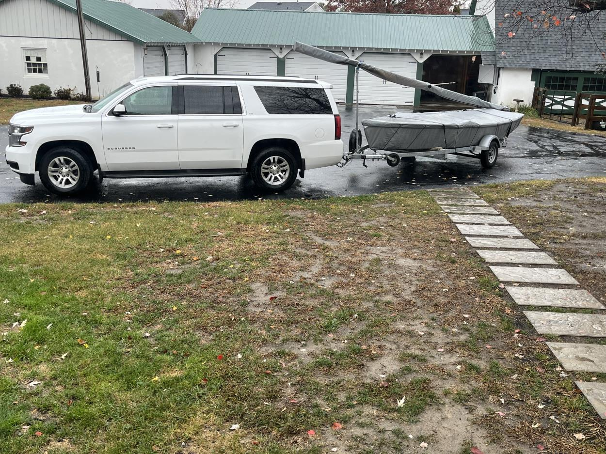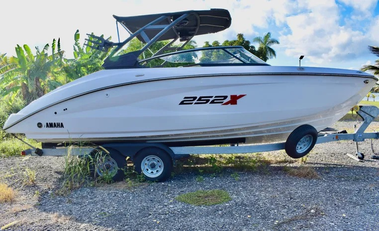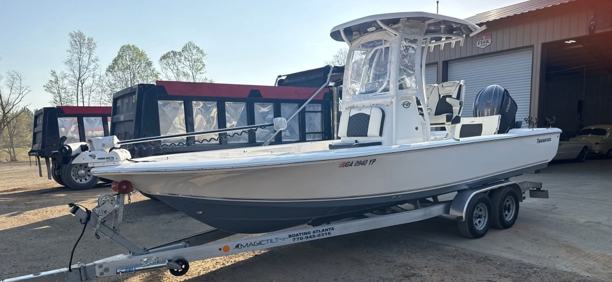 Boat is lightweight (~4,500 lbs total with trailer). Mast is down and secured. No special permits required (under 8.5 ft width).