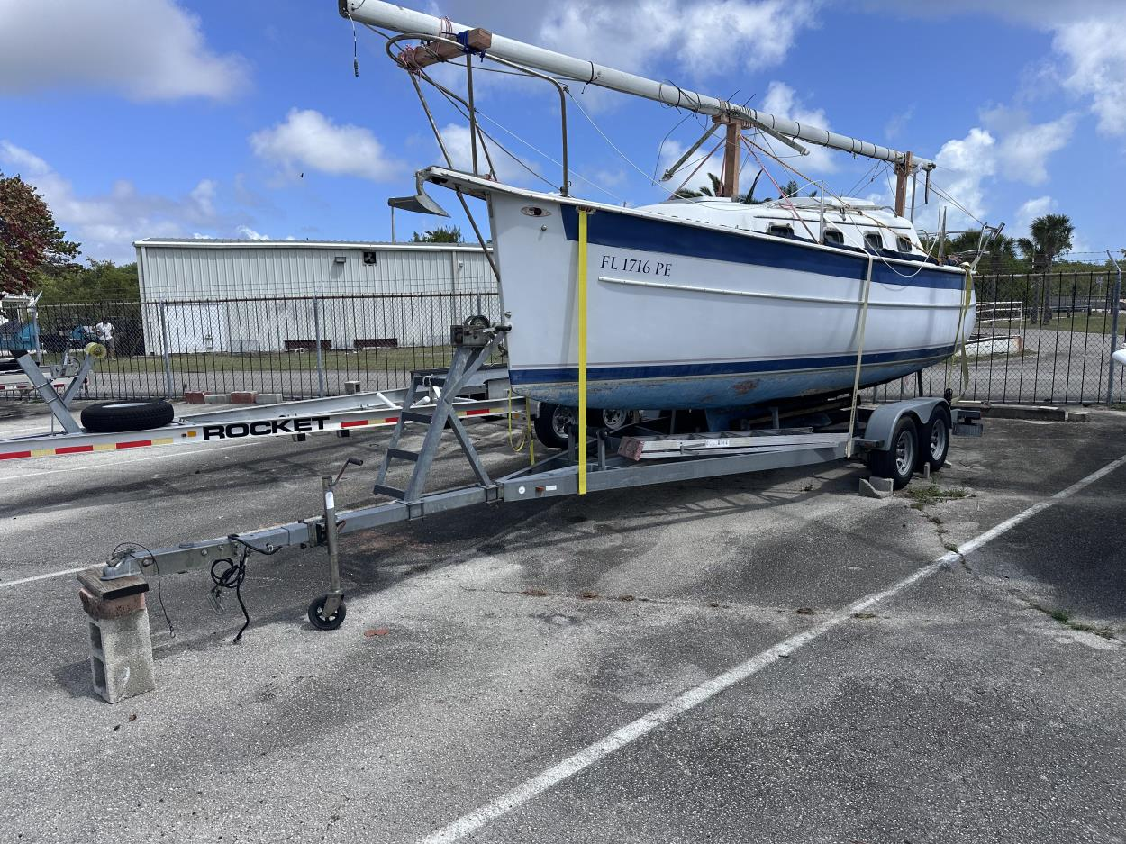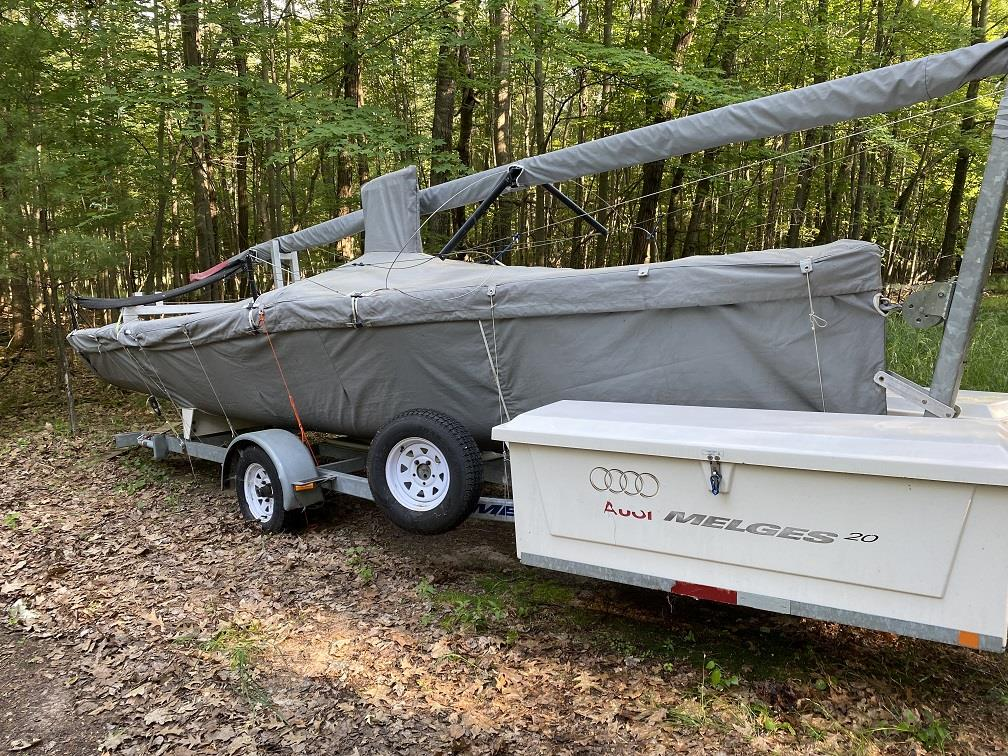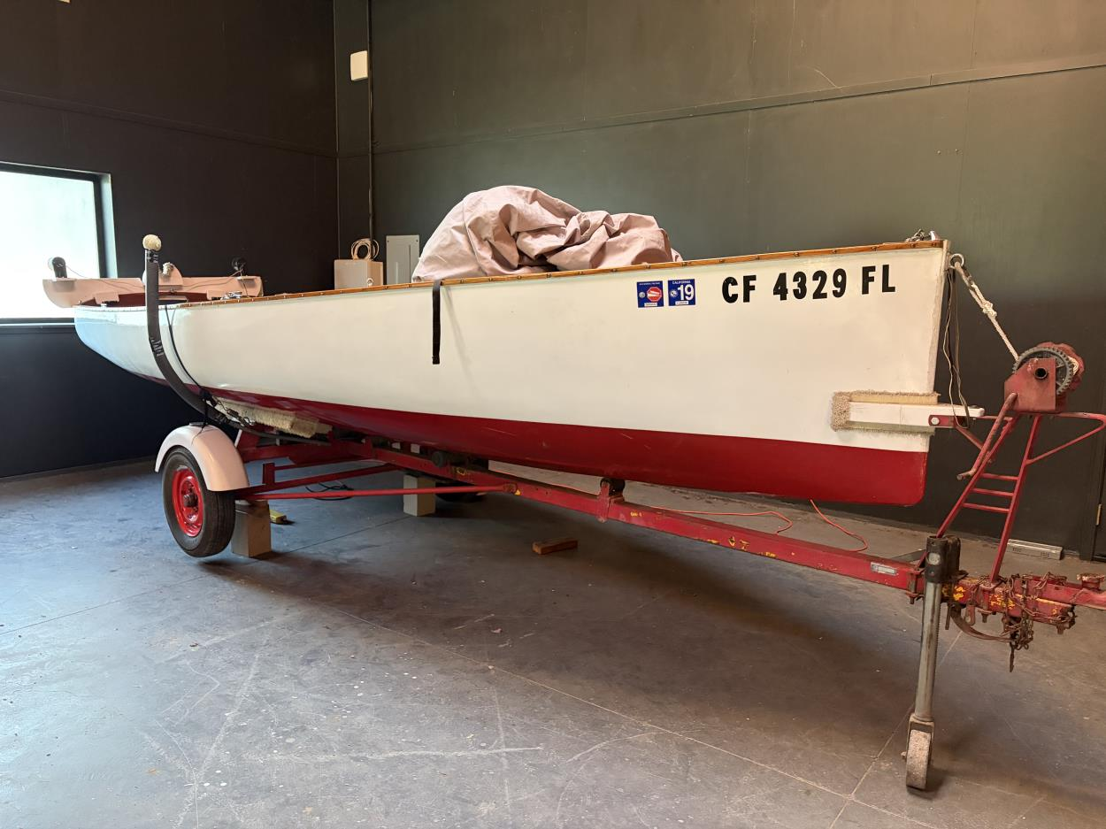 Rhodes 19 sailboat on its trailer. Boat is professionally shrink-wrapped for transport and ready for pickup.