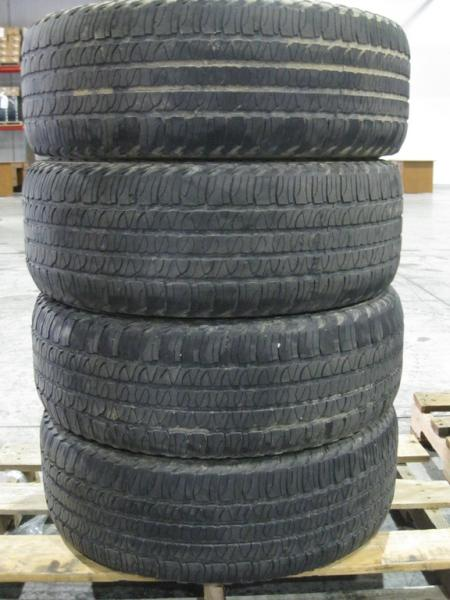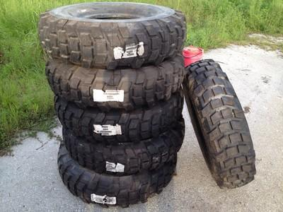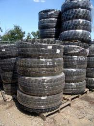 16 clean used tires. They can go on these four pallets as pictured (4,4,6,2 tires) or we can put on only three pallets (5,5,6 tires) or two pallets with 8 tires on each, or they can all be rolled around loose, they weigh 30 lbs each, Whatever fits your load.