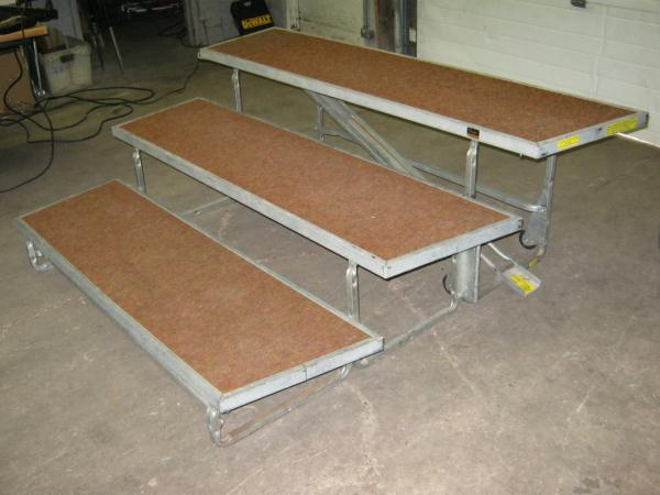 Pieces are metal and wood auditorium stage set pieces. Some could be stacked or put on end.