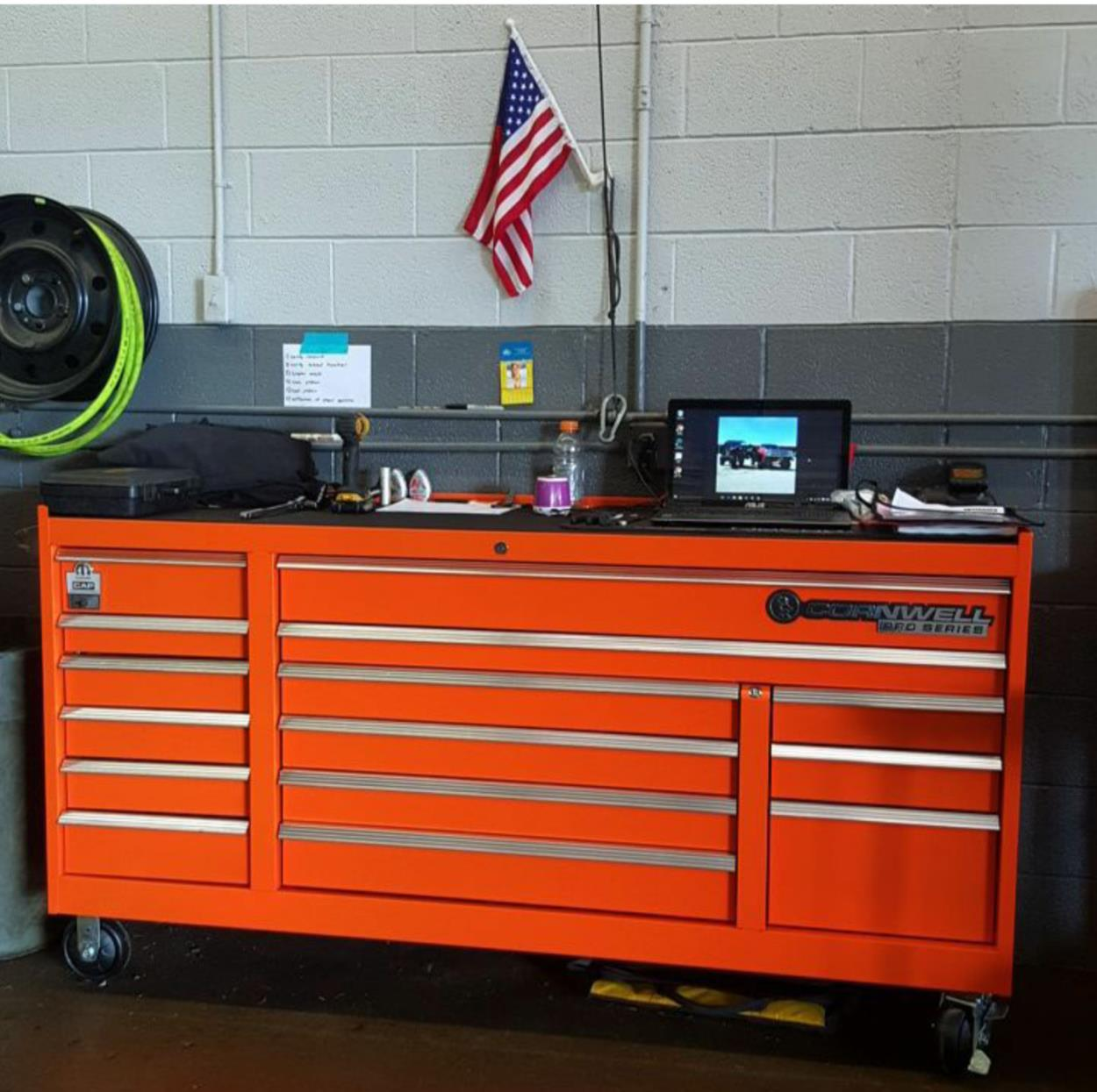 3 rolling tool boxes, old race tires, tools, gear