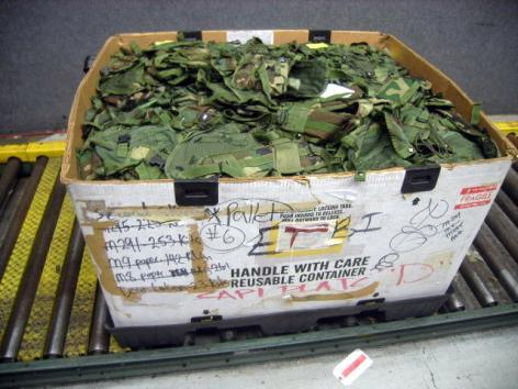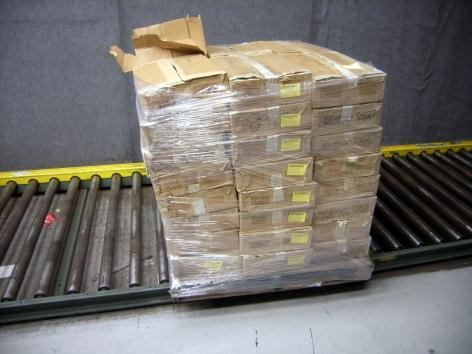 product is being shipped in a plastic tote strapped to a pallet.