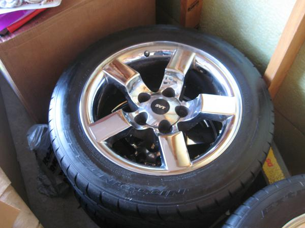 4 weels with tires mounted plastic wrapped on a standard pallet