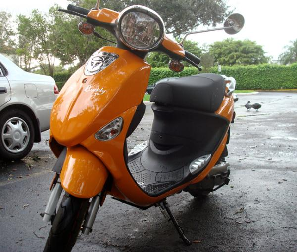 Buddy scooter 50cc 2009 orange. It is currently sitting outside my mom's condo. Truck can pull up to curb. Nice neighborhood.