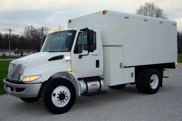 2012 IH 4300 single Axle Chip Truck. Dimensions approx 15k lbs. 10.5 feet tall. About 8 feet wide. 23 feet in length.