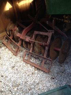 There is a snow blade on the front of the tractor and here are the measurements for the implements: Disc L 5'3" x W 4' x H 2', Mower L 5'9" x W 5'3" x H 1' 3", Plow L 4' x W 1' 4" x D 1' 4", Implements weigh about 850lbs total. (I also have a standard kitchen stove to include- 4' x 3' x 3' and 150lbs)