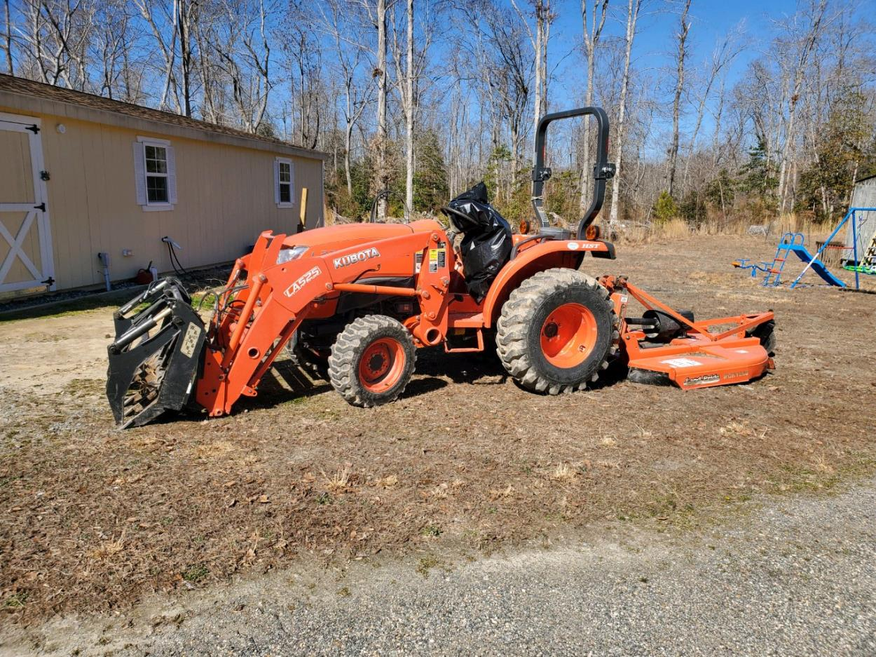 Tractor has front end loader with grapple attachment and brush hog on back of tractor. Additionally there is a 160 lb bucket and 404 lb box blade needing shipped with tractor. Total weight should be 6075 with all implements added. Tractor is 21’ long with grapple and brush hog. Bucket will need an additional 3’ and 2’ for box blade. Tractor runs and will drive on to a trailer with ramps. There will be someone to help load with a drive on trailer. Pick up and drop off times are between 0800 and 1800.
