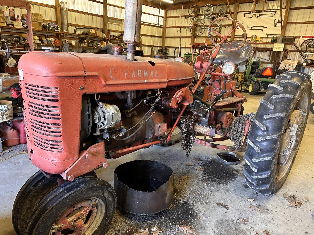 This is a cab tractor with a disk harrow on it and a bucket loader. 20' long, 77" wide, and about 7500lbs total weight..