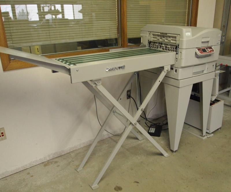 The system can be bundled together into a smaller area. The picture shows the system still setup. The printer (has red control panel) can be removed from the stand and the conveyor (has green belts) can be collapsed as well.