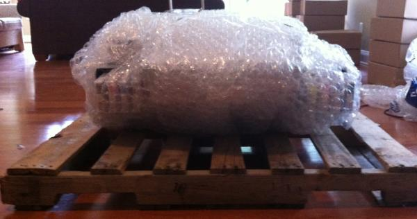 I'd like these vending machines to be wrapped in moving blankets when transported and they have to be transported out of any precipitation.