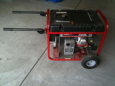 one generator weights around 100lb, the other one weighs around 150lb. this is an estamate I know it takes 2 guys to lift the big one off the ground into a truck ,or one guy can roll it up a ramp.