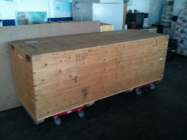 crate is on dollies for movement to dock only.
