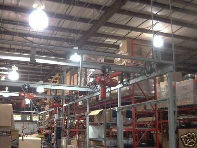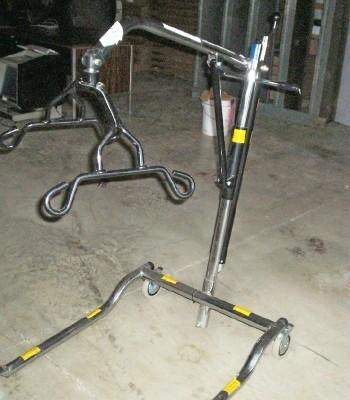 Each patient lift CAN be dismantled, however, if not, each one has a U-shaped, steel base with four wheels that CAN be locked. Attached to the base is a steel bar that is perpendicular to the base. Attached to the bar is a hydraulic piston and then a metal sling that is parallel to the base.