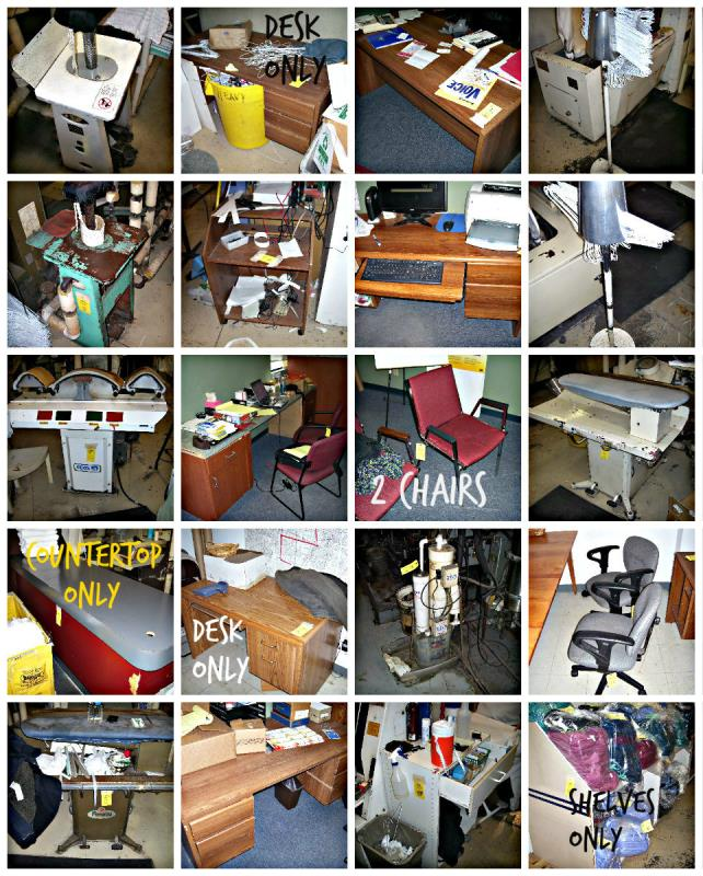 used dry cleaning equipment, desks, shelves etc.